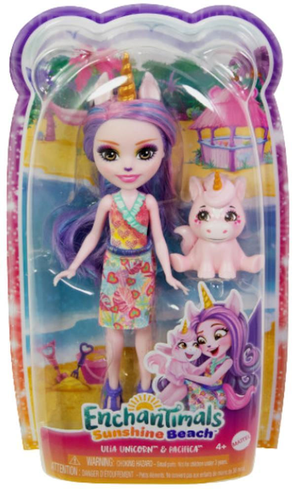 Colecția de păpuși Enchantimals este un grup de prieteni adorabili care împărtășesc o legătură specială cu cei mai buni prieteni animale. Păpușa unicorn Ulia și prietena ei animală atașabilă Pacifica sunt mereu împreună la Sunshine Beach! Ulia are părul multicolor, un top de plajă și o fustă detașabilă. Prietena Pacifica este mereu alături de ea! Copiilor le va plăcea să se joace cu legătura specială Enchantimals™ pe care o împărtășesc aceste cele mai bune prietene și vor dori să le colecționeze pe toate!