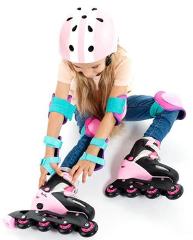 Полный набор розовых регулируемых наколенников, налокотников и защиты запястий для девочек. Размер М для детей от 3 до 10 лет. Подходит для коньков, скейтбордов, велосипедов и аттракционов. Защищайте локти, колени и запястья от трения и переломов.