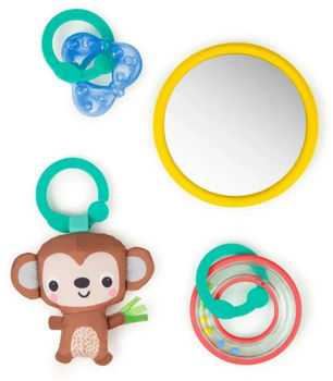 🐒 4 подвесные игрушки – мягкая обезьянка с колокольчиками, безопасное зеркальце, погремушка с разноцветными шариками и игрушка с разными текстурами для развития тактильных ощущений.