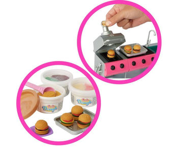 Вечером можно приготовить ужин – в наборе есть три баночки теста разных цветов для создания ингредиентов. Используйте форму для барбекю, чтобы сделать аппетитные бургеры, или приготовьте блюда с помощью эффекта изменения цвета, имитируя процесс жарки на гриле во время игры! Для этого понадобится губка-кисть и холодная вода. Повторять волшебное приготовление можно снова и снова, ведь теплая вода убирает цветной эффект жареной пищи.