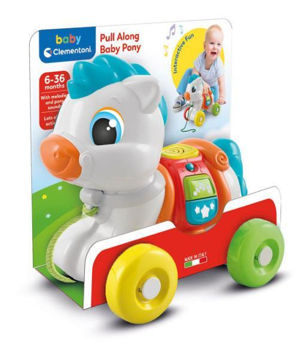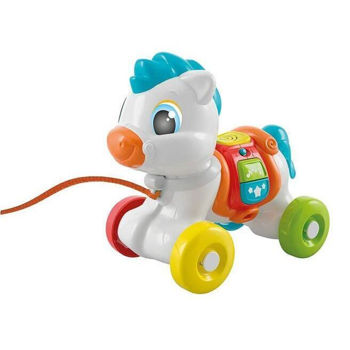 Un ponei drăguț pe care îl poți lua cu tine oriunde. Prin butoanele de pe șa, poneiul prietenos prinde viață, mănâncă, râde și distrează bebelușul cu efecte sonore. Cu butoane interactive, roți și o frânghie, poneiul sprijină dezvoltarea senzorială și motrică. Un personaj iconic din linia Baby Clementoni, foarte iubit de copii. Specificații: Vârsta minimă recomandată: 6 luni Baterii: 2x LR03 (incluse).