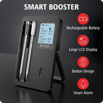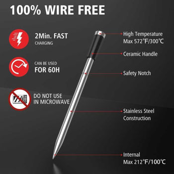 Термометр поставляется с двумя щупами (белым и чёрным) для лёгкой идентификации. Время работы аккумулятора усилителя составляет 40 часов , а быстрая двухминутная зарядка щупа обеспечивает более 60 часов работы . Идеально подходит для длительной готовки.