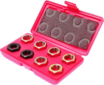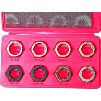 В комплект входят 8 плашек, которые применяются во время работ по восстановлению резьбы шейки оси размерами М24х1.5, М24х2.0, М22х1.0, М22х1.5, М20х1.5, М20х1.25, 13/16"х20 UNEF, 3/4"х20 UNEF;